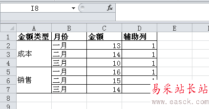 1、在C列添加輔助列來做出分色背景。輔助列的數值為1就行。
