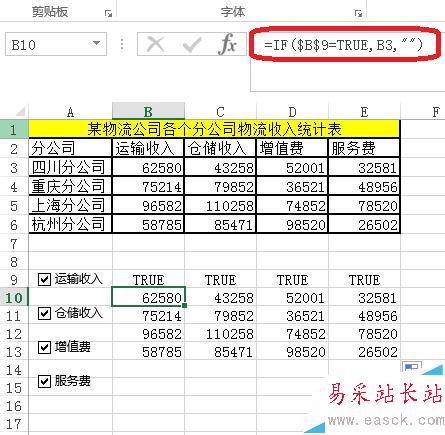 1、如圖所示,輸入公式=if($B$9=TRUE,B3,“”),通過下拉復(fù)制公式。通過if函數(shù)返回動(dòng)態(tài)數(shù)據(jù)。復(fù)選框控件鏈接的單元格=TRUE返回?cái)?shù)據(jù),否則無數(shù)據(jù)。
