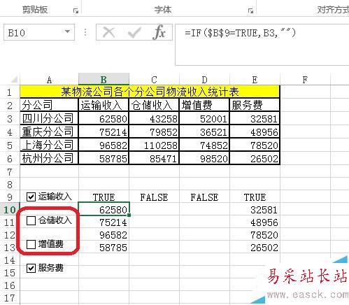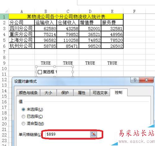 3、復(fù)選框控件效果,如圖所示,勾選——單元格顯示TRUE,不勾選FALSE。利用這個(gè)特性構(gòu)建動(dòng)態(tài)數(shù)據(jù)源。