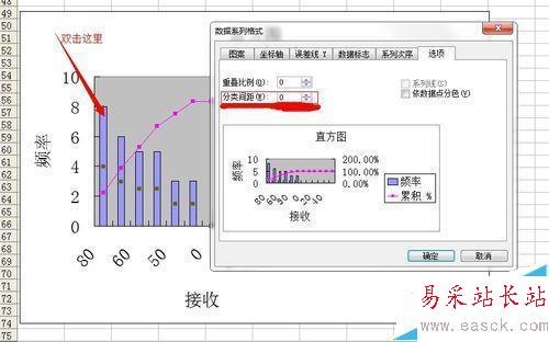 7、這時(shí)雙擊直方圖內(nèi)的任意矩形體,彈出對(duì)話框,點(diǎn)“選項(xiàng)”-“分類間距”設(shè)置為0,如圖所示