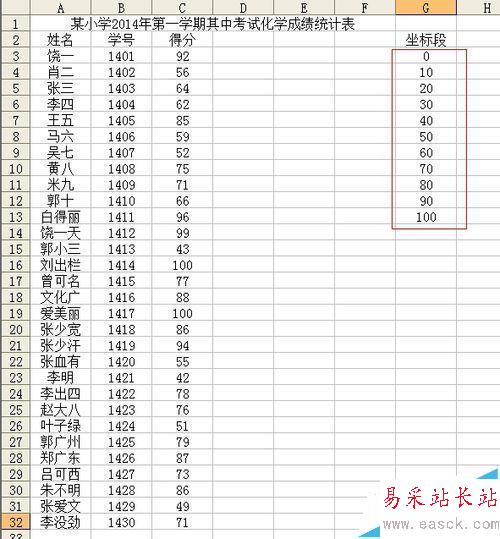 3、我用Excel做了這樣一些數(shù)據(jù),供參考,本例為考試得分,數(shù)據(jù)范圍確定為0-100