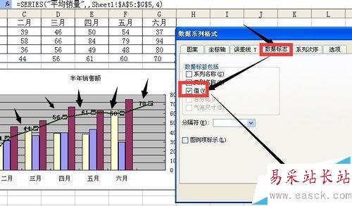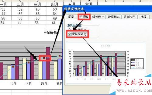 6、雙擊或右鍵點擊折線平均銷量系列 然后在彈出的對話框中點擊坐標(biāo)軸系列