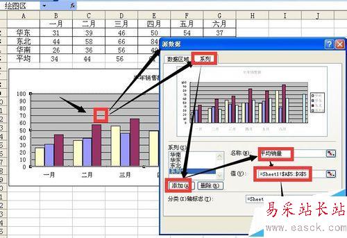 3、在圖表區(qū)域點擊右鍵 在彈出的菜單中選擇數(shù)據(jù)源 點擊 系列選項卡 點擊添加按鈕 名稱為平均銷量 值可以通過鼠標(biāo)選中剛才添加的平均銷量行 然后點確定