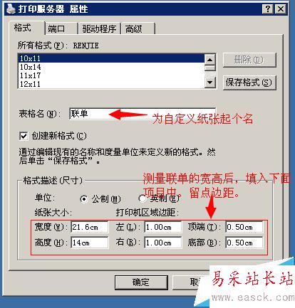 1)格式/表格名后面輸入“聯單”,作為自定義紙張的名稱;