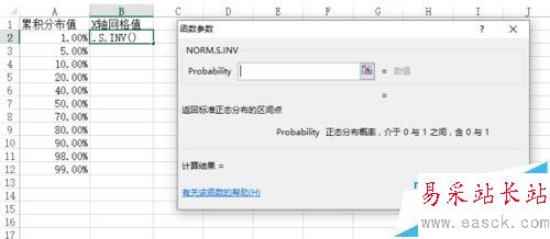 打開2013版excel,按自己的需要輸入一系列累積分布值。在”X軸網格值“那一列的第二個單元格中插入公式"NORM.S.INV"。在彈出的窗口的"probability“處選一開始輸入的系列累積分布值,選確定,空格,填充柄下拉,即得到正態刻度數值。