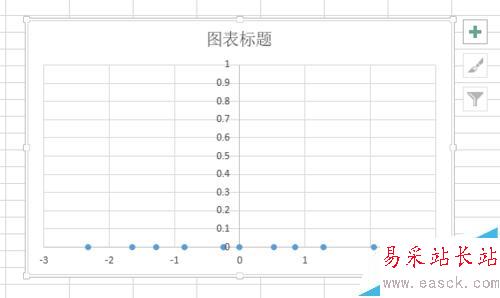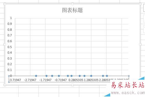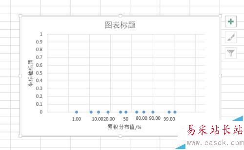 2、往三列第二個單元格輸入0,填充柄填充。以"X軸網格值”為橫坐標,以第三列填充的0為縱坐標,做散點圖。作出的散點圖如下圖一,此時正態刻度以在X軸顯示,接下來要調整坐標軸的格式。