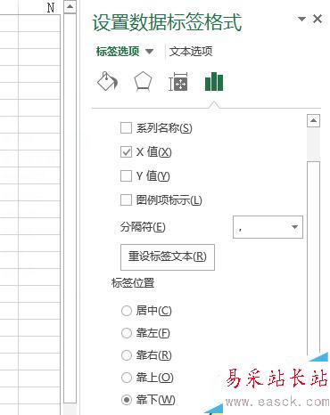 選中橫坐標軸,刪除。選中橫坐標軸線上的點,右擊,選“添加數據標簽”。再一次選中軸上的點,右擊,選“設置數據標簽格式”。在右邊窗口“標簽包括”先勾選“X值”,再把原有的“Y值”的勾去掉,并在“標簽位置”選“靠下”。完成上述步驟后,顯示出來的數據為原始的X軸網格值,可通過手動修改,把想要顯示的數據輸入修改即可得到圖三效果。