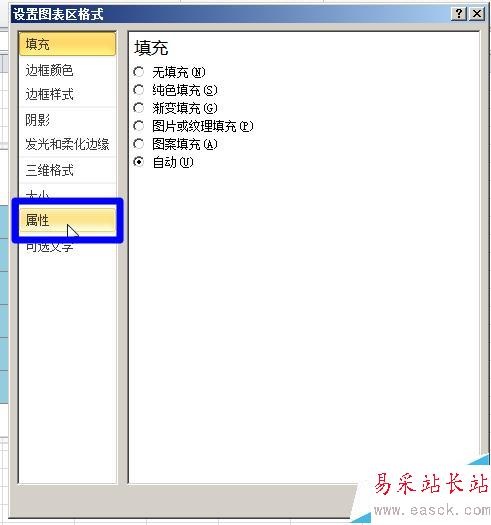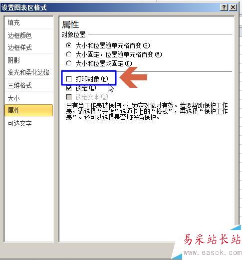 5、在“屬性”框中有一項“打印對象”。如果這一項沒被勾選就不會打印這個圖表。
