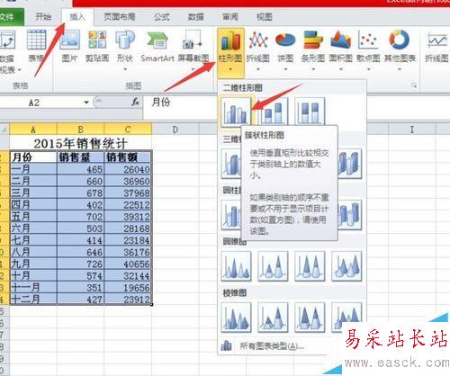 1、選中數據表A2:C14,選擇功能區的“插入”——“柱形圖”——“簇狀柱形圖”
