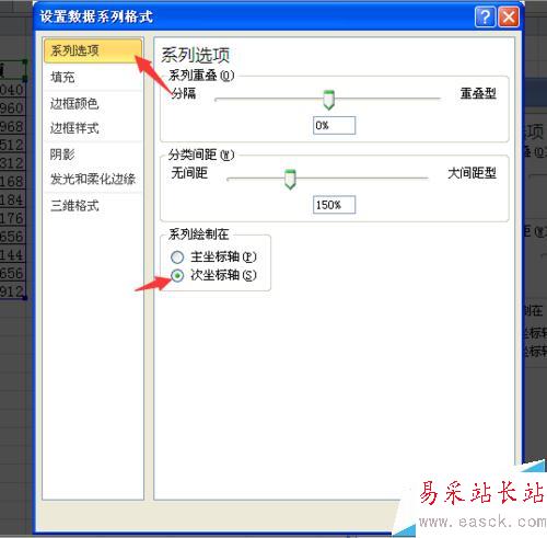 3、選擇“系列選項”——“次坐標軸”——“關閉”。效果如圖