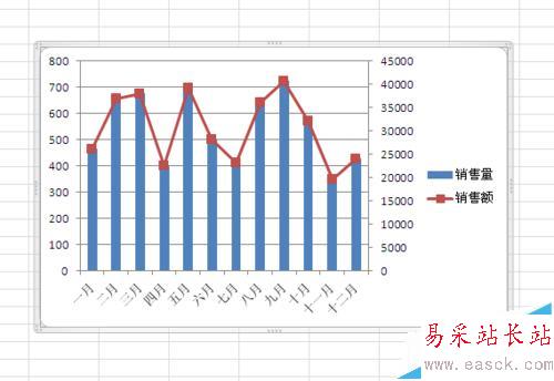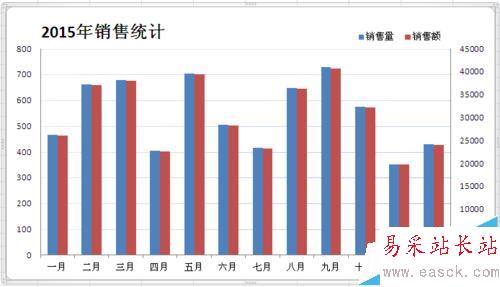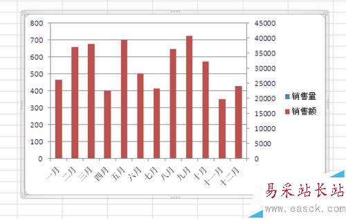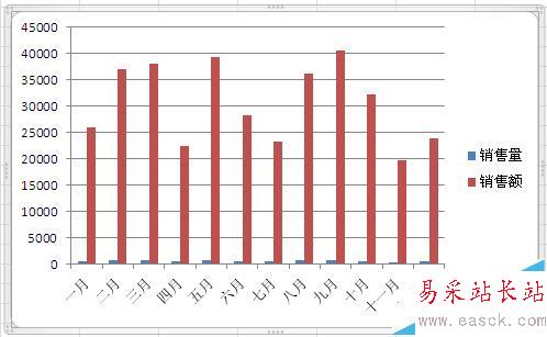 如圖,銷售量和銷售額在數值大小差異過大,如果做在同一張圖表共用一個坐標軸,將一列數據無法正常顯示,如圖顯示,銷售量無法正常顯示。此時我們需要用兩個坐標軸分別表示兩組數據