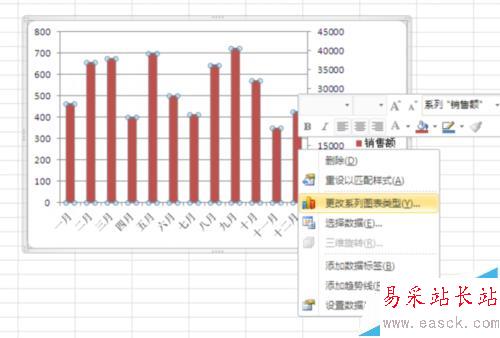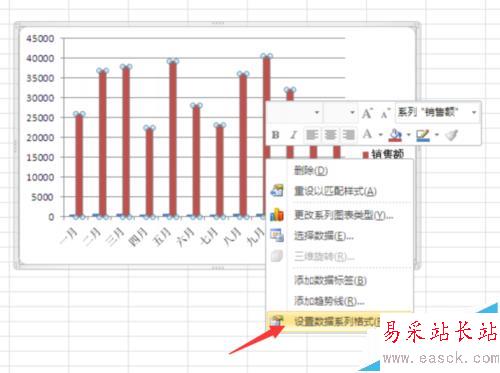 2、在圖表中右鍵單擊“銷售額”柱形,在菜單中選擇“設置數據系列格式”