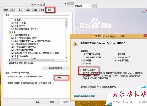 5、關閉excel文檔,打開IE-Internet選項-高級-重置,勾選“刪除個人設置”-重置即可解決