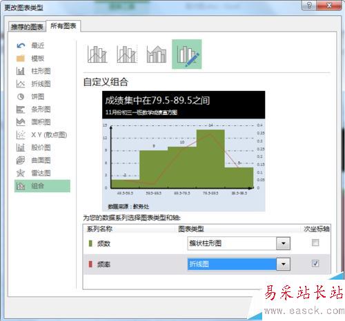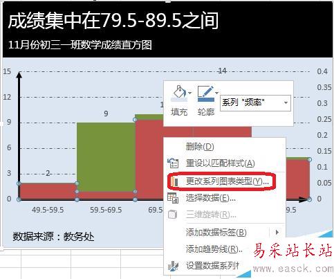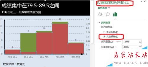 3、右擊(頻率的柱子)——設置數據系列格式——次坐標軸。