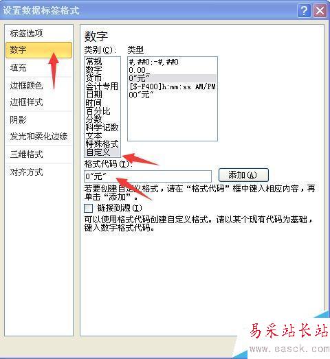 4、在彈出框 中選擇“數字”,在右邊的數字類別中選擇“自定義”,在下方的“格式代碼”中輸入0"元",點擊右邊的“添加”,完成后關閉,結果如下圖。