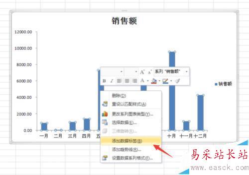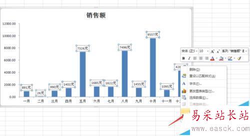 3、此時在柱形上方會顯示銷售額,現在我們需要在銷售額后面添加單位“元”,右鍵單擊數據標簽,選擇“設置數據標簽格式”