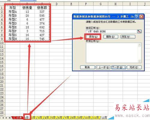 3、在接下來彈出的數(shù)據(jù)透視表和數(shù)據(jù)透視圖3步驟之2b中點按一月工作表標(biāo)簽然后選擇該表中如圖所示的數(shù)據(jù)區(qū)域,然后點按添加按鈕,將所有的12個工作表中的數(shù)據(jù)區(qū)域均添加完成后檢查一下添加區(qū)域的順序,然后點按下一步,然后在數(shù)據(jù)透視表和數(shù)據(jù)透視圖向?qū)?步驟之3中點選新建工作表,然后點按完成。