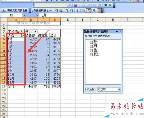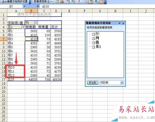 4、這是新建好的數(shù)據(jù)透視表,首先將行字段拖走,然后將頁字段拖動到行字段的位置,通過拖動單元格邊緣將項1到項12重新按順序排列,通過雙擊頁字段所在單元格調(diào)出數(shù)據(jù)透視表字段對話框,將該字段名改為月份,然后將月份字段下的每個項目改為相應(yīng)的月份,然后通過拖動單元格邊框?qū)⒃路輳?月排到12月。