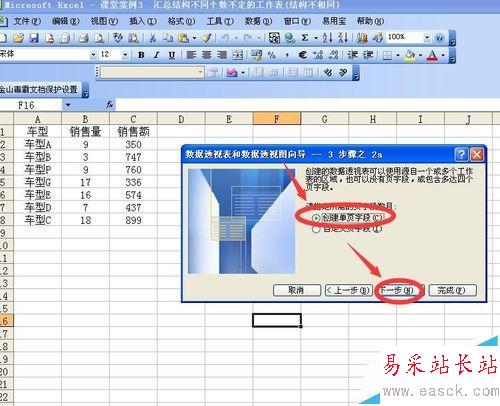 2、點按命令欄數(shù)據(jù)命令,在彈出的菜單中點按數(shù)據(jù)透視表和數(shù)據(jù)透視圖命令,在彈出的數(shù)據(jù)透視表和數(shù)據(jù)透視圖向?qū)?步驟之1中點選多重合并計算數(shù)據(jù)區(qū)域,然后點選數(shù)據(jù)透視表,然后點按下一步,在下一個對話框中點選創(chuàng)建單頁字段,然后繼續(xù)點按下一步