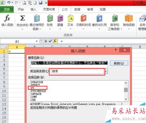3、如果不能直接找到【財務(wù)】的,我們也可以點(diǎn)擊最左邊的【fx插入函數(shù)】,在 彈出的對話框中,選擇類別中選擇【財務(wù)】,選擇函數(shù)中選擇【FV】,并點(diǎn)擊確定