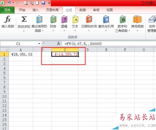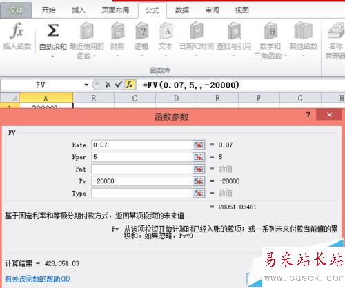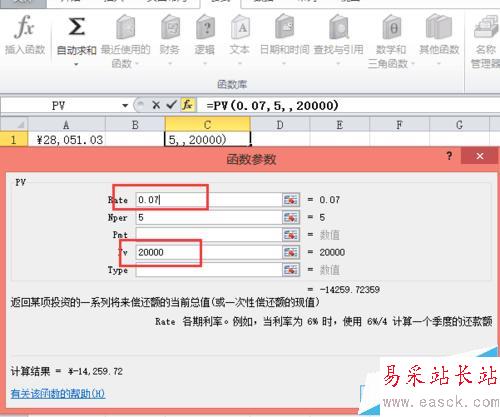 同樣是在【財務(wù)】功能區(qū)中找到PV(PV表示復(fù)利現(xiàn)值),然后在彈出的對話框后,在Rate中輸入0.07,Nepr輸入5,在FV輸入20000(FV表示復(fù)利終值)