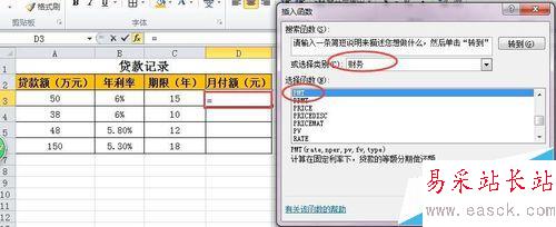 1、選中D3單元格,按鍵盤上的Shift+F3,調出函數窗口,選擇函數類別為“財務”,選中“PMT”函數。