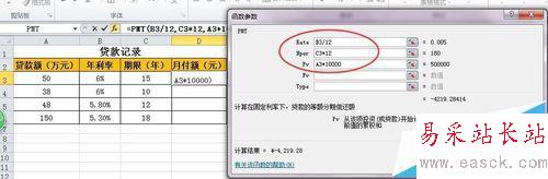 2、單擊確定后,彈出的函數參數窗口,Rate 輸入“B3/12”,(算出每個月的貸款利率)Nper中輸入“C3*12”,(貸款期限變成月數)Pv中輸入“A3*10000”,(萬元轉為元)。
