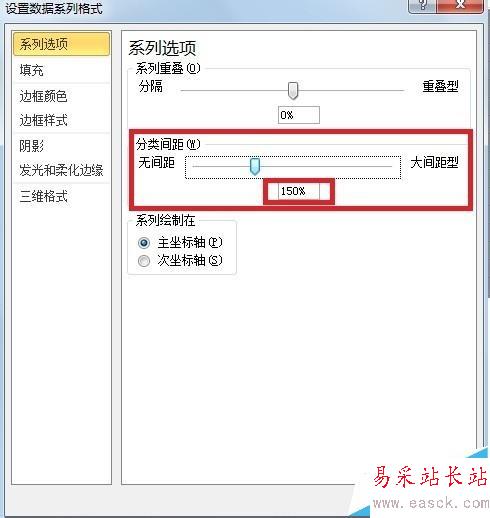 4、在彈出的來的設置繪圖區格式對話框中,可以看到第一個系列選項中的分類間距