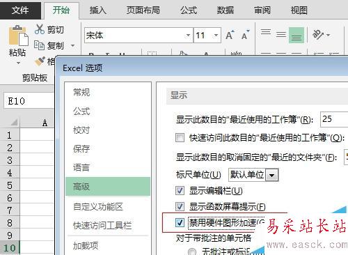 1、 點擊文件>選項>高級,勾選禁用硬件圖形加速。
