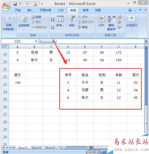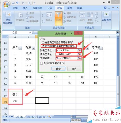 3、假定 需要按語文成績篩選。在任意空白位置,輸入自己的條件,比如,篩選出成績大于90的。點擊“數據”,選擇“高級”。