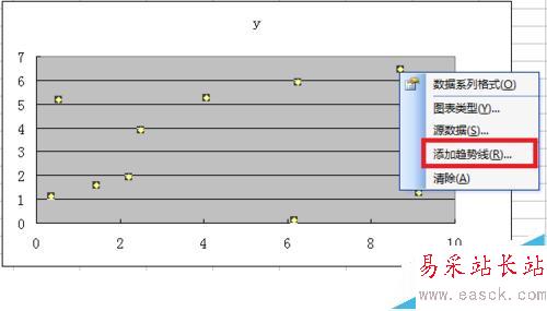 4、所有設置完成后就生成了一幅散點圖,然后在散點上右擊,選擇“添加趨勢線”。具體如圖5。