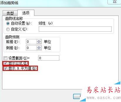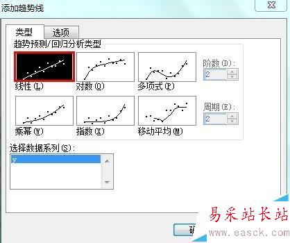 5、在添加趨勢線的選框中,有一個“類型”,這里我們就選擇第一個“線性”,如圖6;而在“選項”里面,我們選擇“顯示公式”和“顯示R的平方值”,如圖7。