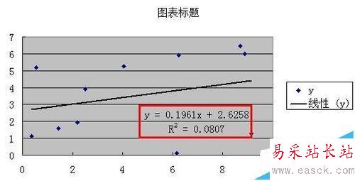 6、這樣在散點圖(圖8)中,我們就可以看見一個公式和R值。這個公式表示的是這些散點的擬合線函數,而R值表示散點數據的線性相關性。