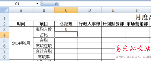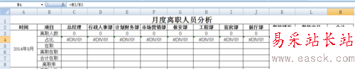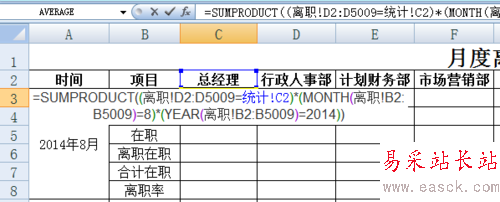 2、選中C3單元格,輸入“=SUMPRODUCT((離職!D2:D5009=統計!C2)*(MONTH(離職!B2:B5009)=8)*(YEAR(離職!B2:B5009)=2014))”,回車即可直接生成總經理(部門)2014年8月份的離職人數;依次在D3至L3單元格輸入對應公式,生成對應部門2014年8月份離職人數;求和即為2014年8月份離職總人數,占比則為當月部門離職人數除以當月離職總人數即可。
