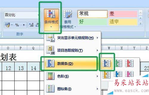 4、下面我們就把進度條設(shè)計成實時跟進工程進度的進度條。按住ctrl鍵,把所有進度框選擇起來,右鍵,設(shè)置單元格格式,將單元格屬性調(diào)成百分比格式;然后,保持所有進度框選擇情況下,在工具欄里“條件格式”下選“數(shù)據(jù)條”下面的一種喜歡的樣式。