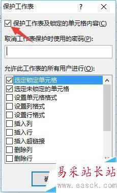 5、勾選“保護工作表及鎖定的單元格內容”,也可以設置一個密碼,單擊“確定”完成。