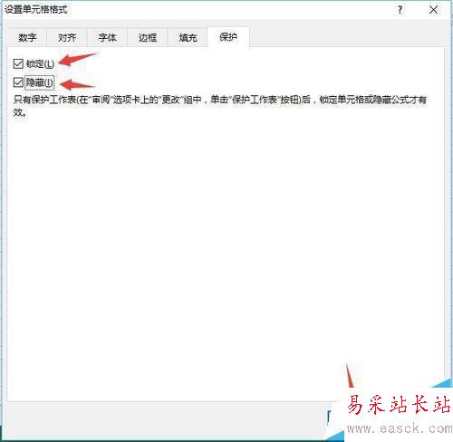 3、單擊“保護”選項卡,勾選“鎖定”和“隱藏”- 單擊“確定”。