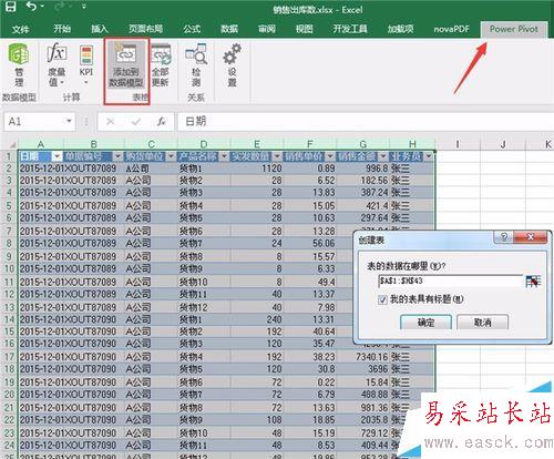 3、添加表建立數(shù)據(jù)模型。在銷售出庫表,整列整列地選擇表,點選菜單→PowerPivot→添加到數(shù)據(jù)模型→勾選我的表含有標題,確認。第一次啟動PowerPivot會很慢,要耐心等待。同樣道理,將跟蹤的訂單號也添加進去。