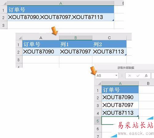 2、規(guī)范訂單號列表→按列排序。經(jīng)理給的訂單號列表是一個單元格存儲了很多個單號,這樣是無法進行匹配查詢的。先將它用逗號分列成橫表,再復制選擇性粘貼→轉(zhuǎn)置粘貼成豎表。