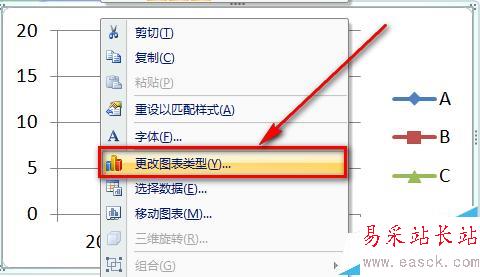 2、做圖表中鼠標右鍵,選擇【更改圖表類型】。