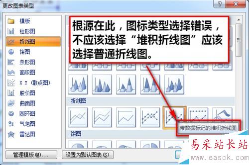 3、我們把鼠標懸浮在當前圖表類型的按鈕上,會看到當前圖表是【帶數據標記的堆積折線圖】。這個堆積圖會將數值加在一起,導致了圖表反應與實際數值不一致。