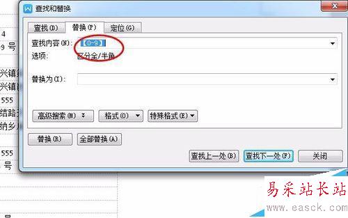 2、這個時候我們使用替換和查找,Ctrl+H或者是右上角的查找按鈕都是可以的。在查找的內容里面輸入:[0-9]