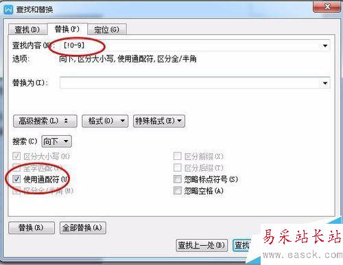 6、同樣的我們也是在word文檔進行替換,這個時候我們就在數(shù)值0的前面加一個!就可以了:[!0-9]