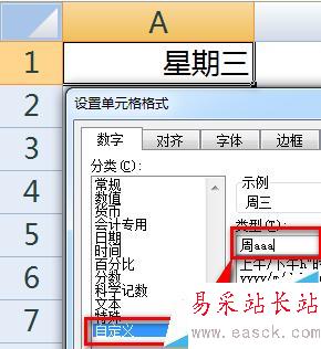 選中A1,鼠標(biāo)右鍵,選擇【設(shè)置單元格格式】,在【自定義】中輸入“周aaa”,這樣A1單元格將返回如“周三”這種表示方式。