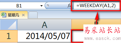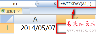 雙擊B1,輸入函數(shù):=WEEKDAY(A1,1),將返回2014年5月7日在一個星期中的序號為4。第二參數(shù)為1表示一周以周日為第一天。