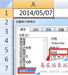 選中A1,鼠標(biāo)右鍵,選擇【設(shè)置單元格格式】,在【自定義】中輸入dddd,這樣A1單元格將返回如“Wednesday”這種英文表示方式。