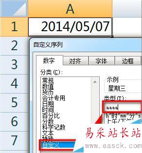 選中A1,鼠標(biāo)右鍵,選擇【設(shè)置單元格格式】,在【自定義】中輸入aaaa,這樣A1單元格將返回如“星期三”這種表示方式。