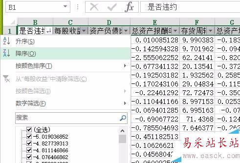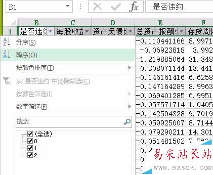4、圖示樣例中,我們對B列和C列同時進行篩選。我們點擊圖示B列的倒三角,在彈出的下拉框中點擊降序。