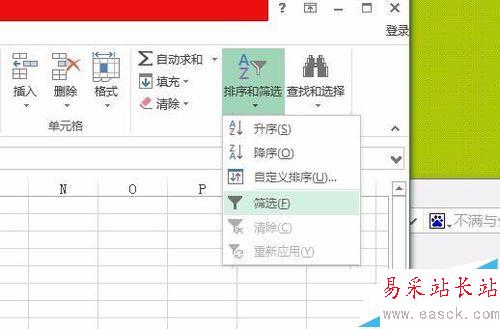 3、在打開的排序和篩選下拉框內選擇【篩選】,數據的第一排即可進行篩選操作了。