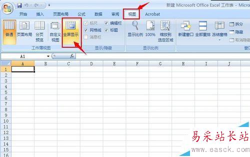 1、切換到“視圖”標簽,點擊“全屏顯示”,整個工作表將滿屏顯示。
